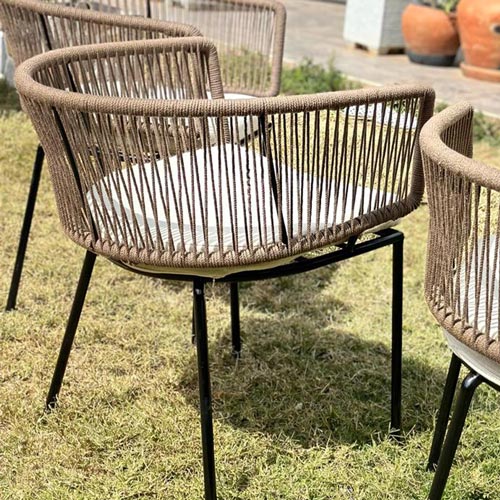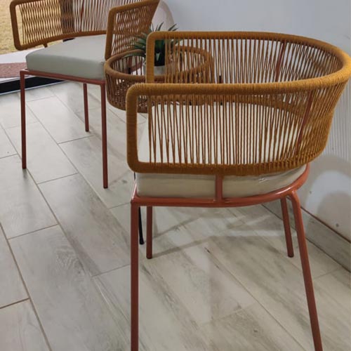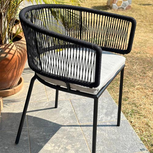 Son tressage en nylon et coton, minutieusement réalisé à la main, repose sur une structure en acier noir qui lui confère solidité et durabilité. Chaque corde tressée reflète un travail artisanal soigné, garantissant une chaise élégante, résistante et adaptée à un usage quotidien aussi bien en intérieur qu’en extérieur.