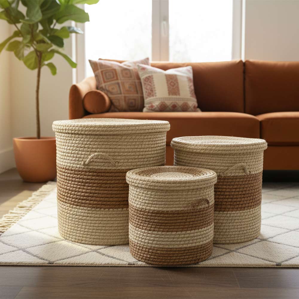Chez Amboha, chaque panier de rangement est une pièce unique, façonnée à la main avec passion et précision. Parce que chaque intérieur a son style, nous offrons la possibilité de personnaliser vos paniers sur demande. Vous pouvez choisir parmi une variété de coloris, de finitions et de tailles pour créer un modèle qui correspond parfaitement à votre univers. Que vous souhaitiez harmoniser vos paniers à votre décoration existante ou apporter une touche de couleur à votre espace, nos artisans adaptent le tressage et les nuances selon vos envies. Une façon élégante de combiner authenticité, artisanat et sur-mesure dans votre décoration.